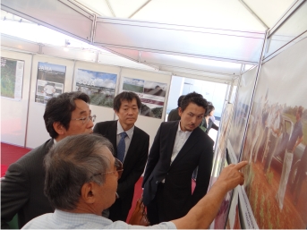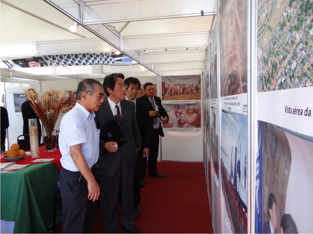 Logo após o ato solene, o Exmo. Sr. Umeda visitou o stand “Cooperação Japão – Brasil” acompanhado pelo Dr. Akimoto, vice-presidente da CAMPO, que fazia explanações sobre a trajetória do PRODECER e evolução da agricultura com a cooperação